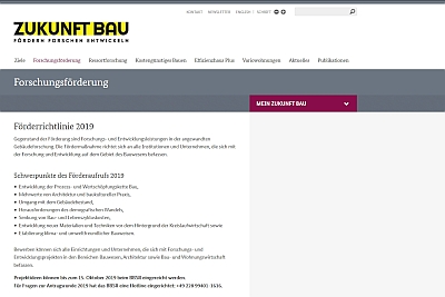 Das Bundesministerium des Innern, für Bau und Heimat (BMI) hat gemeinsam mit dem Bundesinstitut für Bau-, Stadt- und Raumforschung (BBSR) am 22. Juli 2019 die Förderrunde des neu zugeschnittenen Innovationsprogramms Zukunft Bau gestartet. Bewerben können sich alle Einrichtungen und Unternehmen, die sich mit Forschungs- und Entwicklungsprojekten in den Bereichen Bauwesen, Architektur sowie Bau- und Wohnungswirtschaft befassen. Projektideen können bis zum 15. Oktober 2019 beim BBSR eingereicht werden.