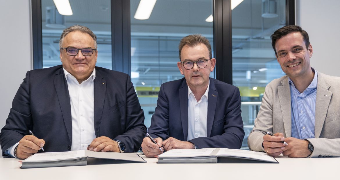 V.l.: Andreas Darlath (Head of BU Fabrication der Schüco International KG), Ludger Martinschledde und Hendrik Pahlsmeyer. Foto: Schüco International KG / Carmen Wolf