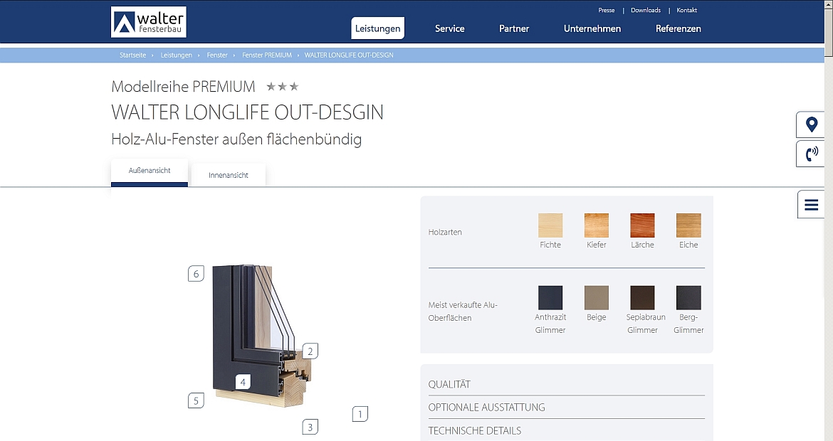 Zum einen sind die Produkte inhaltlich für einen unbedarften Fensterkäufer verständlich erklärt, zum anderen finden Architekten, Fachspezialisten sowie die Walter-Fachhandelspartner sämtliche für sie relevanten Informationen rasch und übersichtlich. Die Startseite gibt einen ersten Überblick über die Produktwelt von Walter. User können über die dargestellten Produktwelten oder über die Hauptnavigation auf relevante Informationen direkt zugreifen, und zwar in der für sie gewünschten Tiefe an Leistungsbeschreibung. Alle Produktlinien zeigen eine Übersicht über die angebotenen Systeme und geben Informationen bis hin zu Ausführungsarten der einzelnen Modelle.
