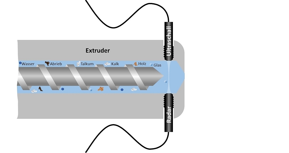 Sowohl ultraschall- als auch radarbasierte Verfahren ermöglichen eine Inline-Detektion von Fremdmaterialien wie Holz, Glas, Metallabrieb oder abgebautem Material im Extruder. Grafik: SKZ
