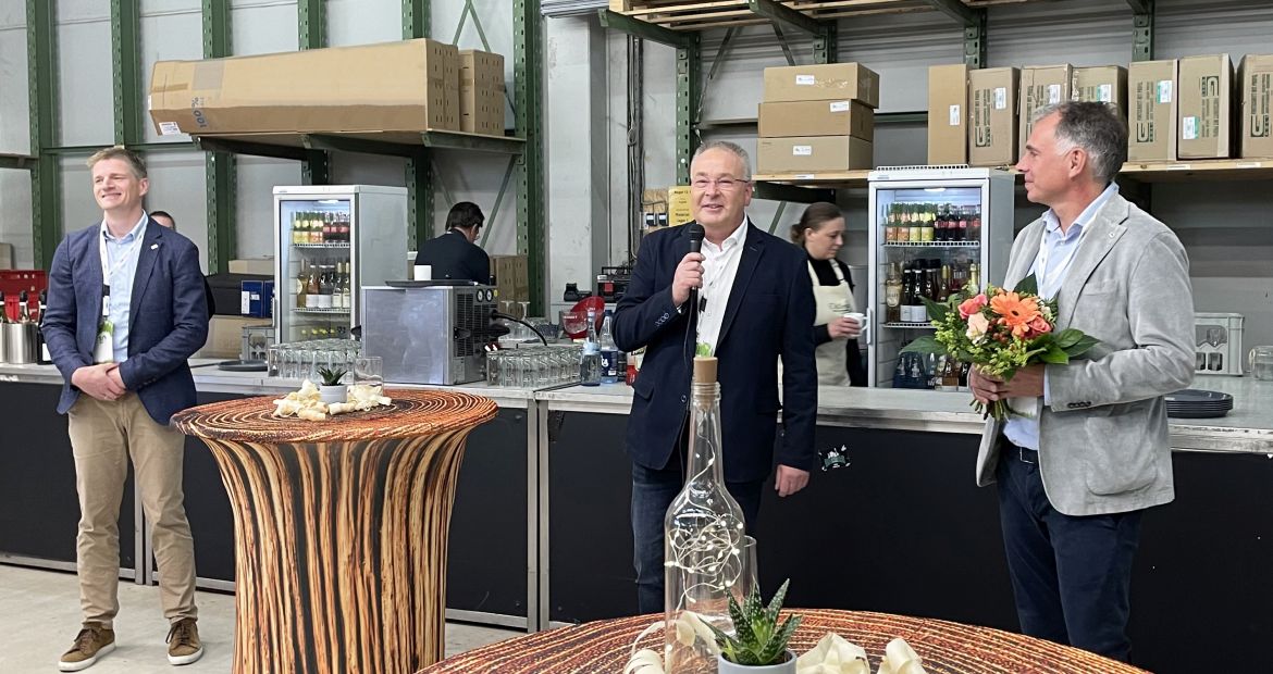 V.l.: Hanjo Junkelmann, Holger Asche und Jan-Peter Albers begrüßen Mitarbeitende und ihre Angehörigen zum Familienfest anlässlich des zehnjährigen Bestehens des Unternehmens. Foto: Aldra