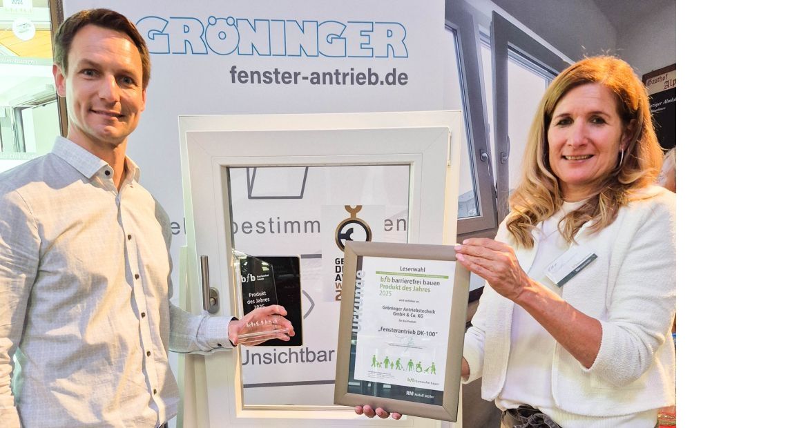 Die Firma Gröninger Antriebstechnik freut sich, dass der Fensterantrieb DK-100 bei der Leserwahl „bfb barrierefrei bauen“ den Preis Produkt des Jahres 2025 im Rahmen der Fachtagung „bfb barrierefreies bauen“ in Köln Anfang Oktober gewonnen hat.