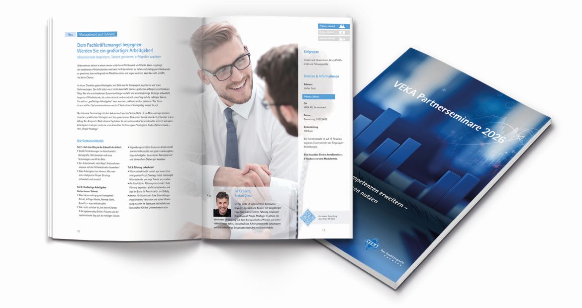Mit der gewohnten Mischung aus neuen und bewährten Themen decken die Veka Partnerseminare 2026 erneut die ganze Bandbreite geschäftsrelevanter Bereiche ab – von der Unternehmens- und Mitarbeiterführung über Vertrieb und soziale Medien bis hin zu Anwendungstechnik und Montage. Dabei umfasst das Angebot klassische Präsenzveranstaltungen ebenso wie besonders effiziente, zeitsparende Online-Module.